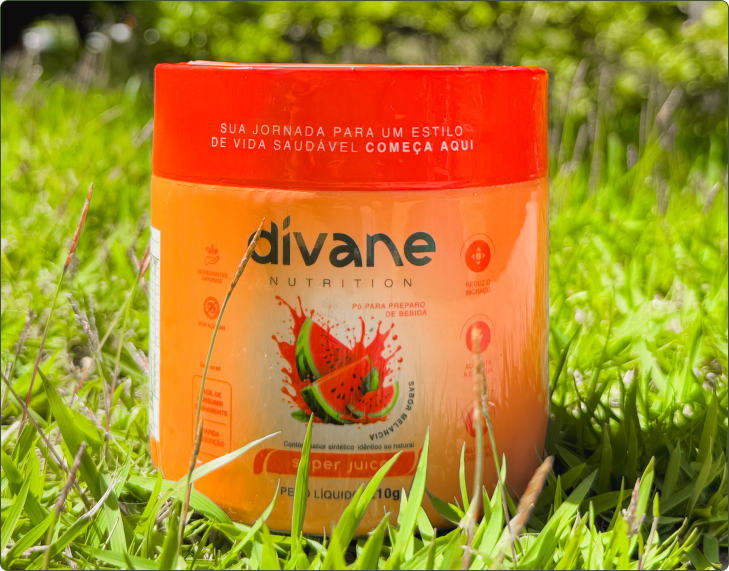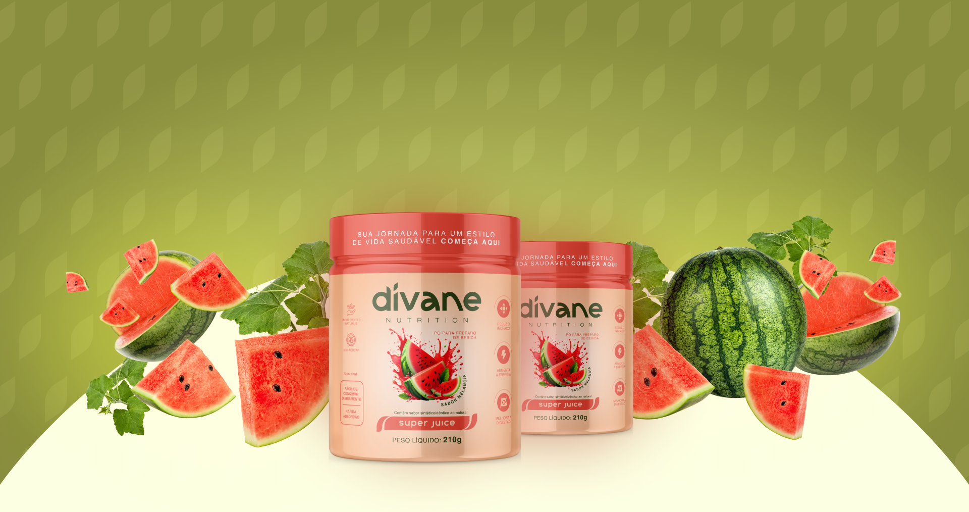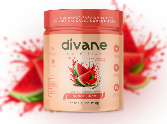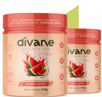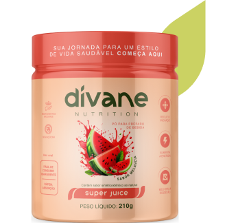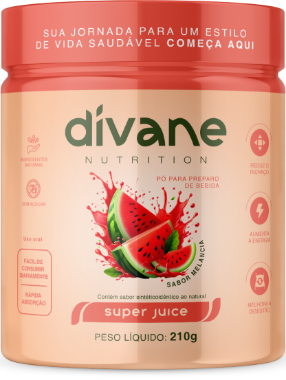 O Super Juice da Divane Nutrition é um suplemento nutricional com sabor delicioso de melancia, desenvolvido para melhorar a digestão, aumentar a energia e fortalecer a imunidade.